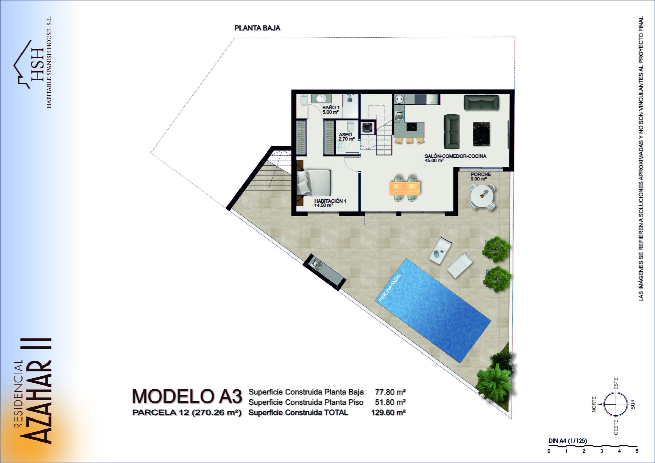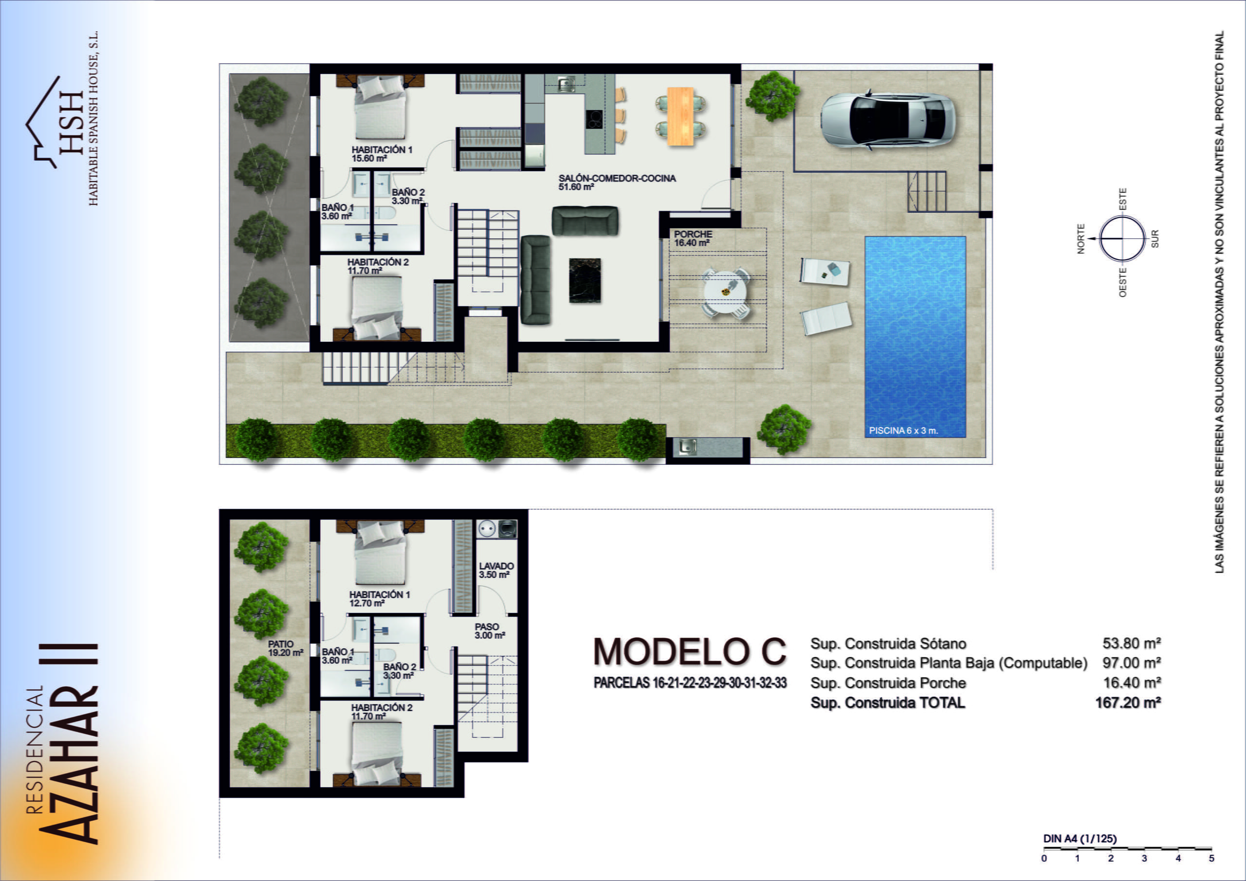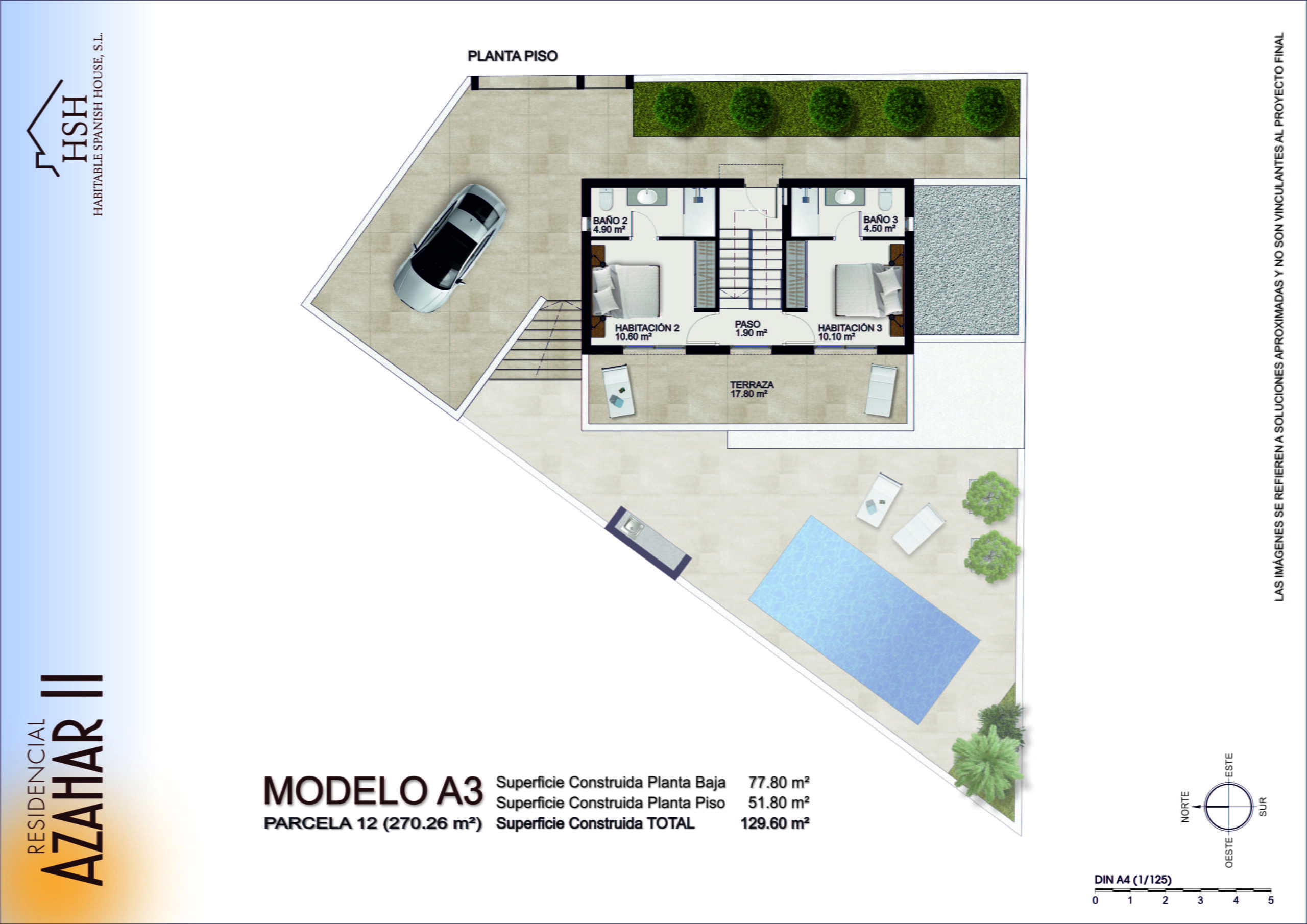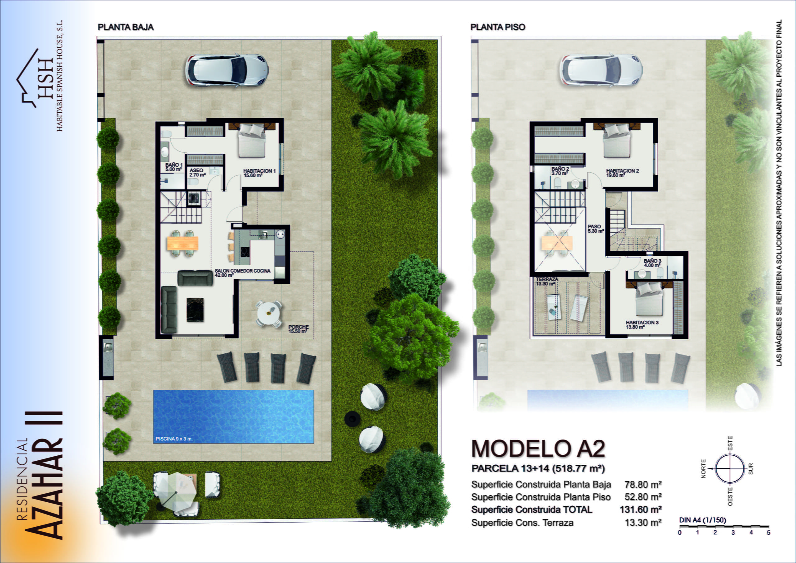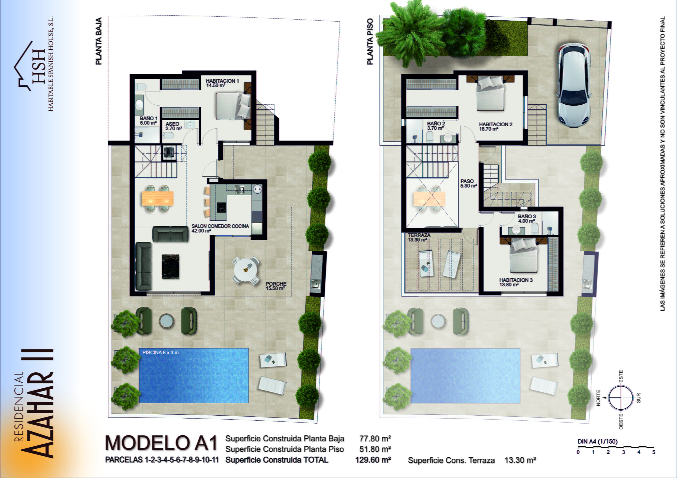 - Model A1 – 2 floor property with 3 bedrooms all with ensuite and built in wardrobes. A comfortable living, dining and kitchen area. A covered porch/terrace area overlooking a private 6m x 3m swimming pool. Private offroad parking for one vehicle. Separate downstairs WC. Upstairs terrace overlooking the pool area. Optional rooftop solarium.