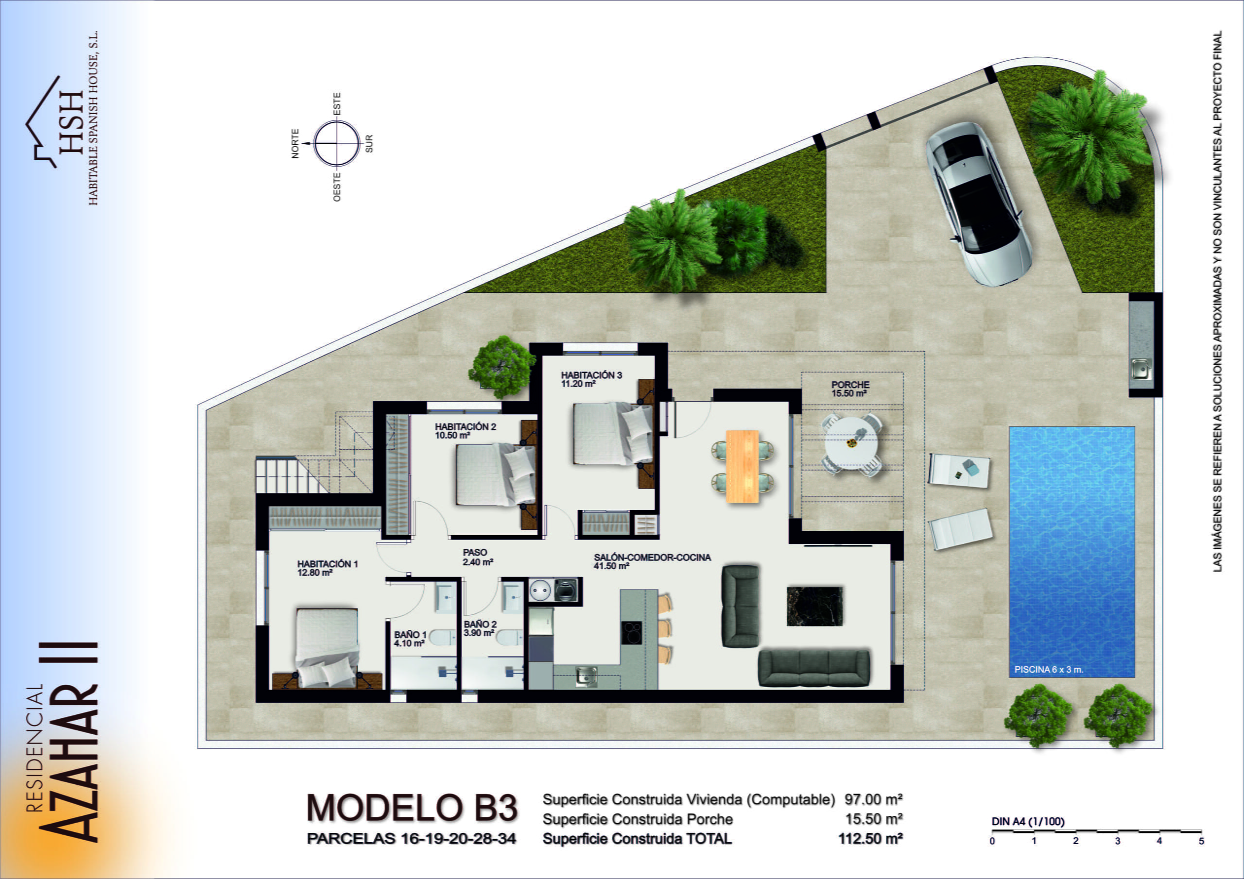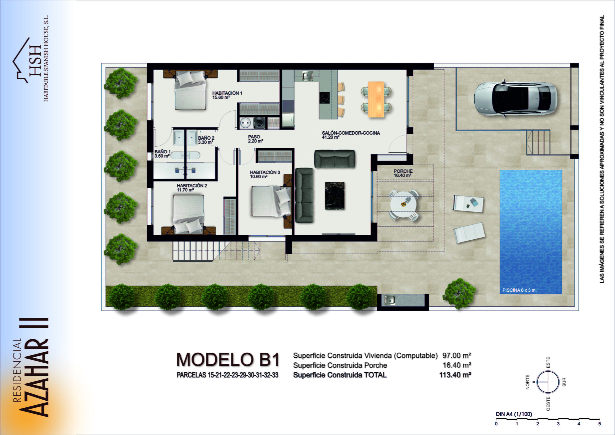 - Model B3 – Corner plot property. 1 floor property. 3 bedrooms, one with ensuite, all fitted with wardrobes. A family bathroom. A comfortable living, dining and kitchen area. A covered porch/terrace area overlooking a private 6m x 3m swimming pool. Private offroad parking for one vehicle possibly two.